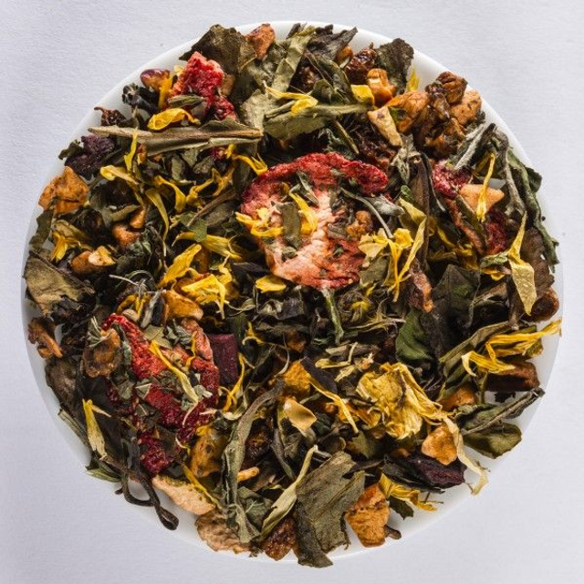 Pomme, thé blanc, écorce d’orange, betterave, baies d'argousier, mélisse, arôme naturel, fraises émincées lyophilisées, fleurs de souci