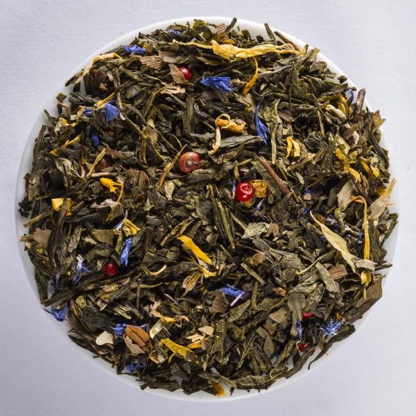 Ce mélange de thé vert à base de merveilleux Sencha est complété par un goût particulièrement doux, frais et corsé grâce au thé chinois Wu Lu - un thé de brume ! Ensemble, ils forment une base parfaitement équilibrée de notes de fruit de la passion et d'abricot les plus fines, qui sont parfaitement souligné par des zestes d'orange acidulées et des morceaux de fruit de la passion ! L'aspect céleste avec ses soucis ensoleillés et ses bleuets bleus ne permettrait pas d'autre nom que 'vie céleste'.